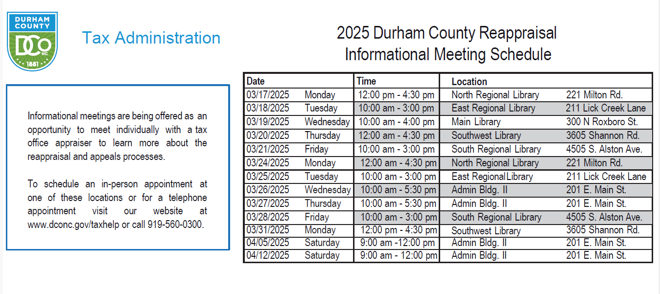 As always, if additional details or guidance is needed, call the the Durham County Tax Administration Office at (919) 560-0300 or email tax-reval@dconc.gov.